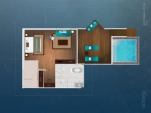 Вилла на воде. Спальня с кроватью king-size, гостиная с обеденной зоной и прозрачными панелями в полу, ванная комната с джакузи и душевой кабиной, терраса с бассейном, обеденной зоной на открытом воздухе и беседкой, прямой спуск к воде. Гостиная и спальня разделены дверью.