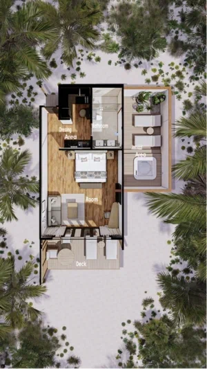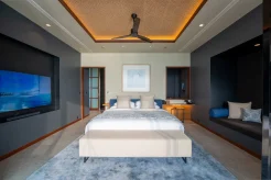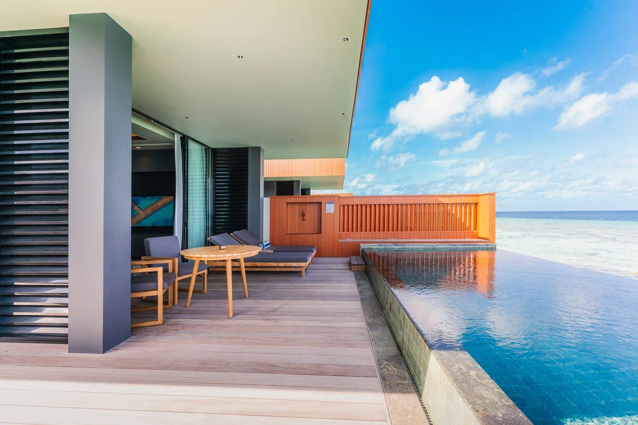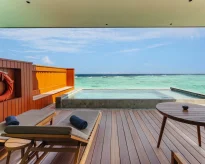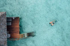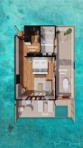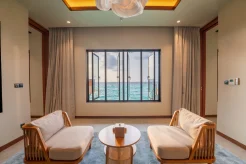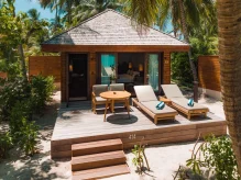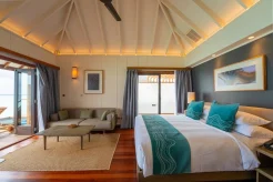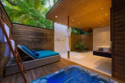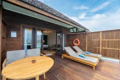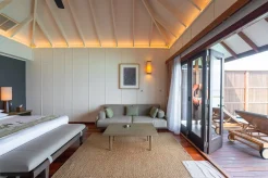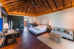 Вилла на воде. Спальня с кроватью king-size, гостиная зона, гардеробная, ванная комната с душевой кабиной и джакузи на открытом воздухе, терраса с прямым спуском к воде.