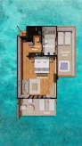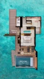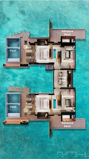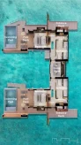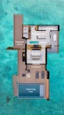 Вилла на воде. 2 спальни с кроватями king-size и гостиными зонами, гостиная, 2 гардеробные, 2 ванные комнаты (каждая с душевой кабиной), 2 террасы с 2 бассейнами, прямой спуск к воде. Гостиная и спальни разделены дверями.