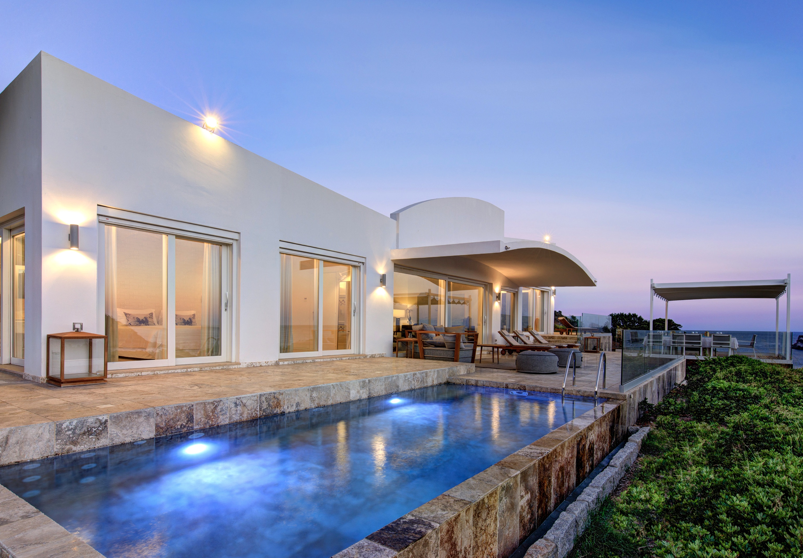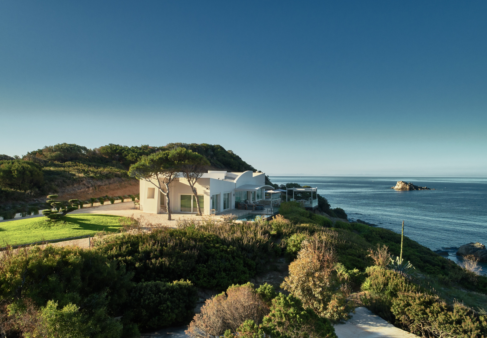 Входящая в портфель Falkensteiner Hotels & Residences белоснежная вилла в стиле модерн занимает привилегированную позицию на возвышенности, откуда открывается панорамный вид на 180 градусов. Её приватную территорию обрамляет собственный сад с оливковыми деревьями. Минималистичные интерьеры выдержаны в элегантной бело-серой гамме. В четырёх спальнях могут разместиться до семи человек.