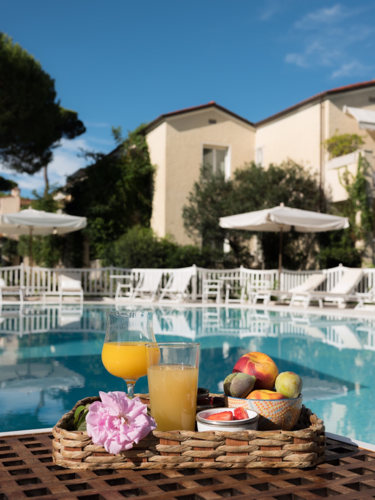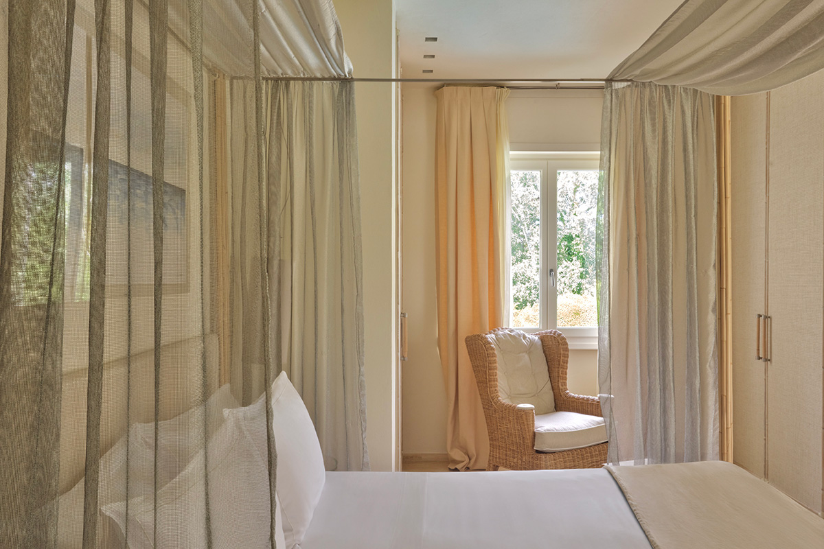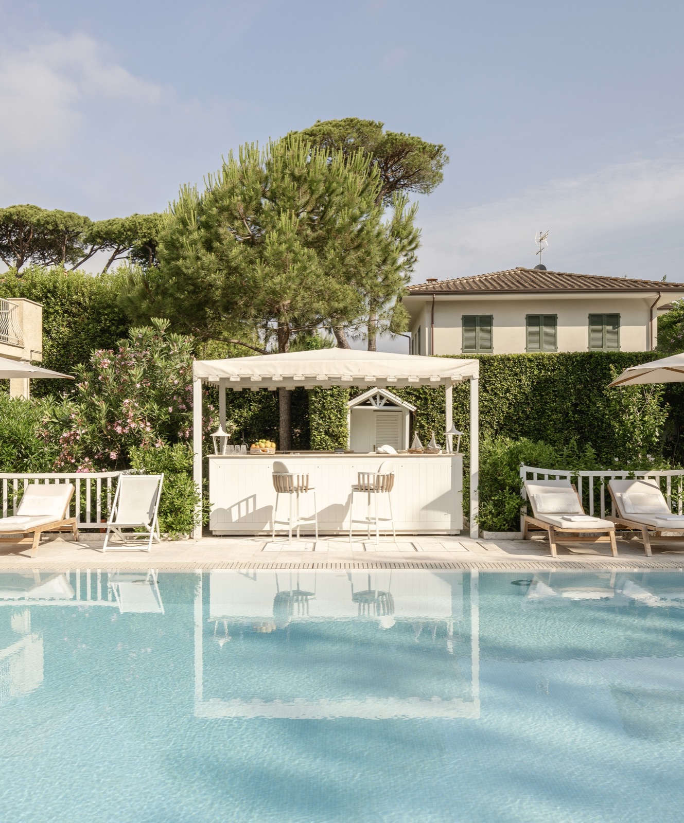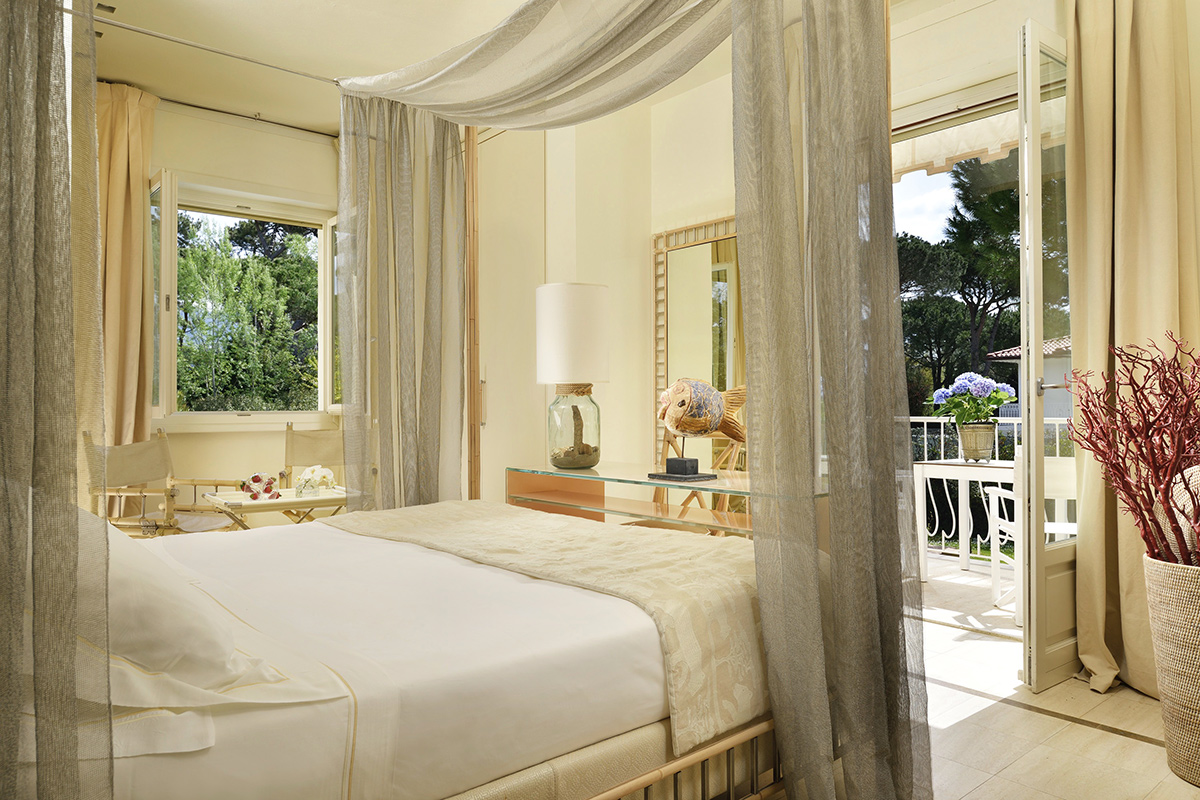 Входящий в гостиничный бренд Collezione EM и ассоциацию Virtuoso отель занимает виллу, построенную в 1960-х годах как летняя резиденция для семьи, на протяжении многих поколений приезжавшей на отдых в Форте-деи-Марми. Атмосфера частного дома бережно сохранена: общие зоны наполнены мебелью ручной работы от местных мастеров, коллекцией диковинок, картин и декора из соседней коммуны Пьетрасанта, известной своими музеями и галереями. Интерьеры номеров выполнены в почти монохромной песочной палитре, создающей ощущение абсолютного покоя. Здесь гостей встречают кровати с балдахинами, элементы в морском стиле, ванные комнаты, отделанные травертином, и селективная косметика сицилийского бренда Ortigia.