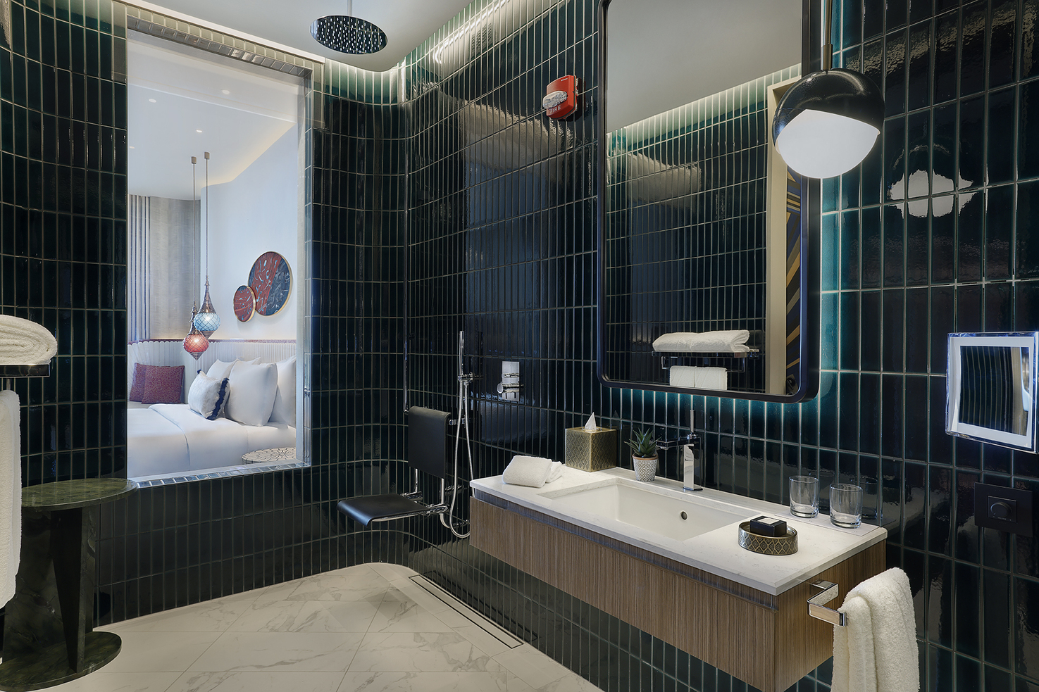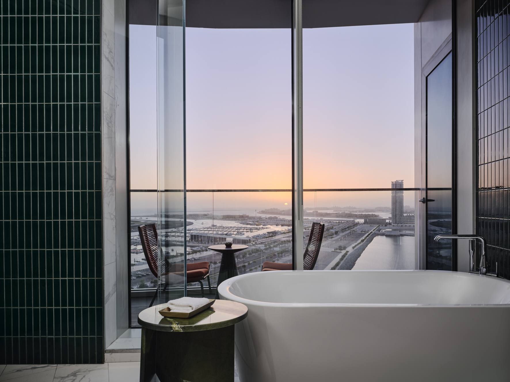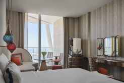 W Dubai – Mina Seyahi расположен на знаменитом пляже Джумейра. Дорога от международного аэропорта Дубая на автомобиле занимает около 25 минут. Отель находится в 10–15 минутах ходьбы от района Dubai Marina и популярного променада The Walk at JBR. Ключевым преимуществом является доступ ко всей инфраструктуре курортного комплекса Mina Seyahi, который объединяет три отеля Marriott на общей территории с 700-метровым пляжем, пляжными клубами и аквапарком Jungle Bay.